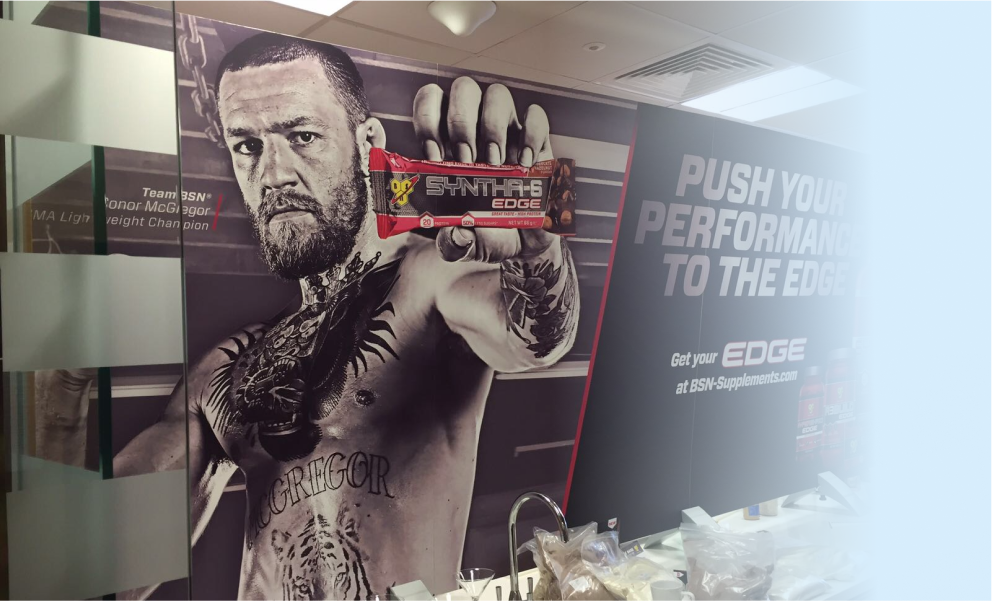 printed vinyl, mounted on 3mm PVC. Feet attached. Double sided, to be used as a counter divider.